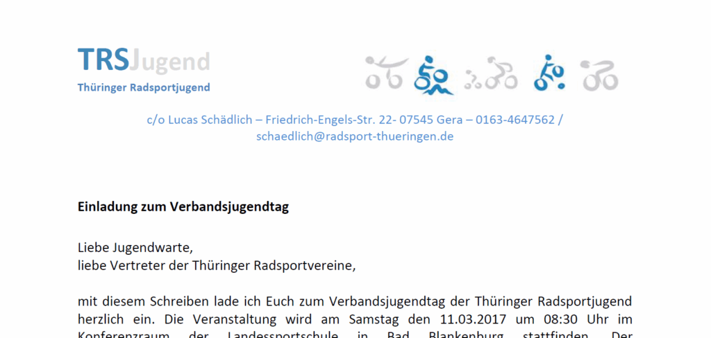 hier im Download (Einladung VJT TRSJ 17) für Euch die Einladung zum diesjährigen Verbandsjugendtag der Thüringer Radsportjugend in Bad Blankenburg.